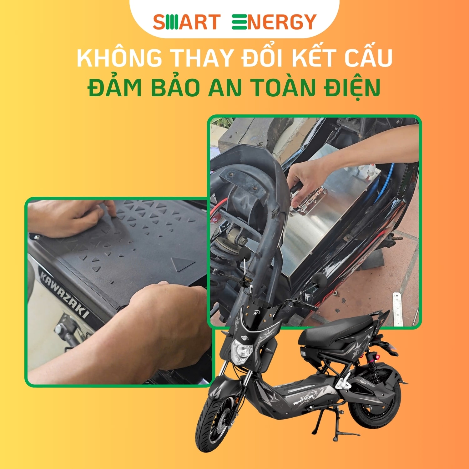 Lắp đặt pin mới: Lắp đặt pin mới. Thùng đựng mẫu pin 60V-40Ah cho mẫu Xmen đảm bảo chuẩn kích thước, khách hàng có thể tự lắp đặt với hướng dẫn kỹ thuật chi tiết của Smart Energy.
